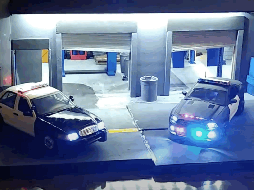 Dans ce diorama à l’échelle 1/18 de la devanture d’un garage automobile, deux voitures de polices sont stationnées tous feux allumées. La voiture de droite dispose d’un système d’éclairage très complet, comprenant les phares mais aussi divers feux clignotants.