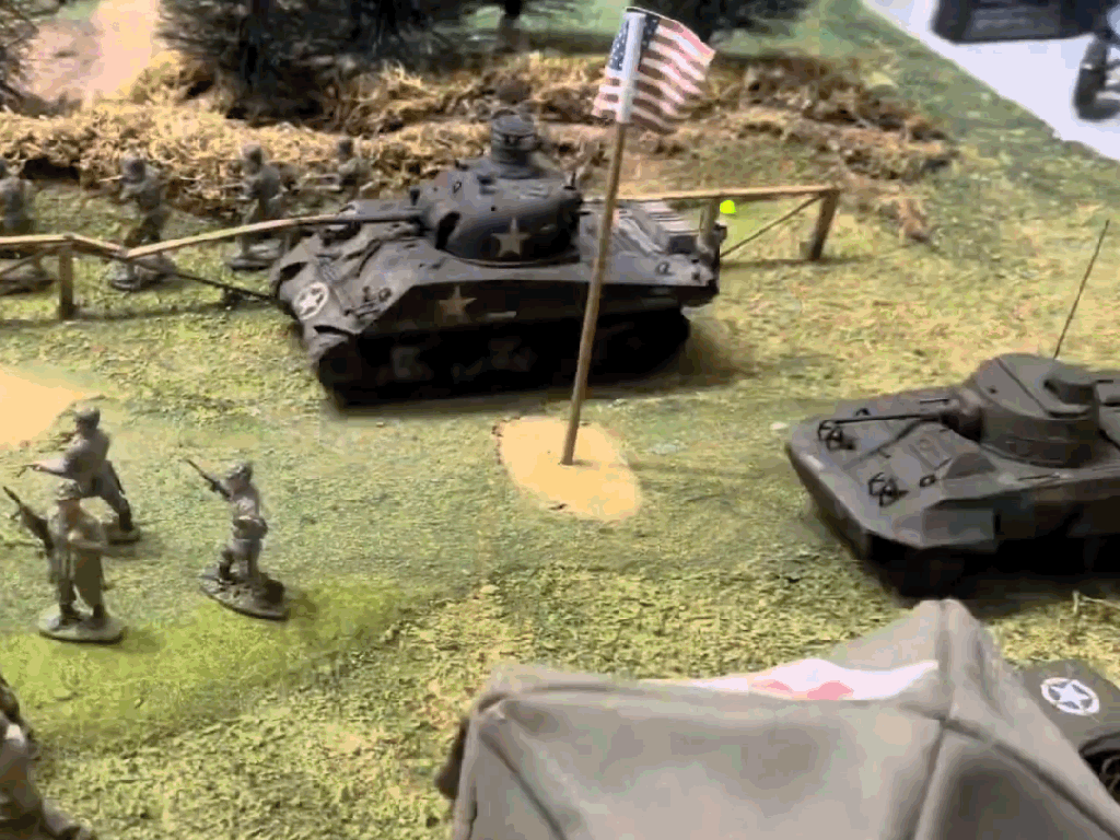 Dans ce diorama à l’échelle 1/35 reproduisant une scène d’un champ de bataille de la seconde guerre mondiale, la réplique du char a été équipée d’un système de motorisation radio-commandé (RC) qui autorise son déplacement au sein du diorama.