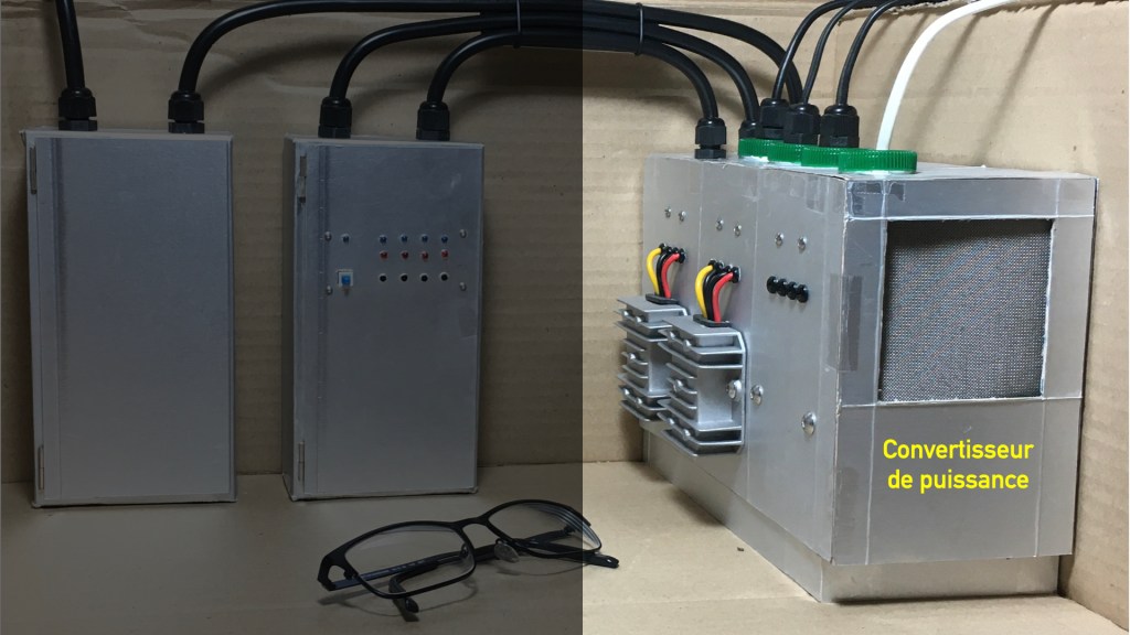 La structure interne du convertisseur de ce prototype du convertisseur de puissance est réalisé en carton. La structure externe, assurant la finition esthétique du convertisseur, est réalisée avec des briques d’emballage alimentaire (intérieur en aluminium).