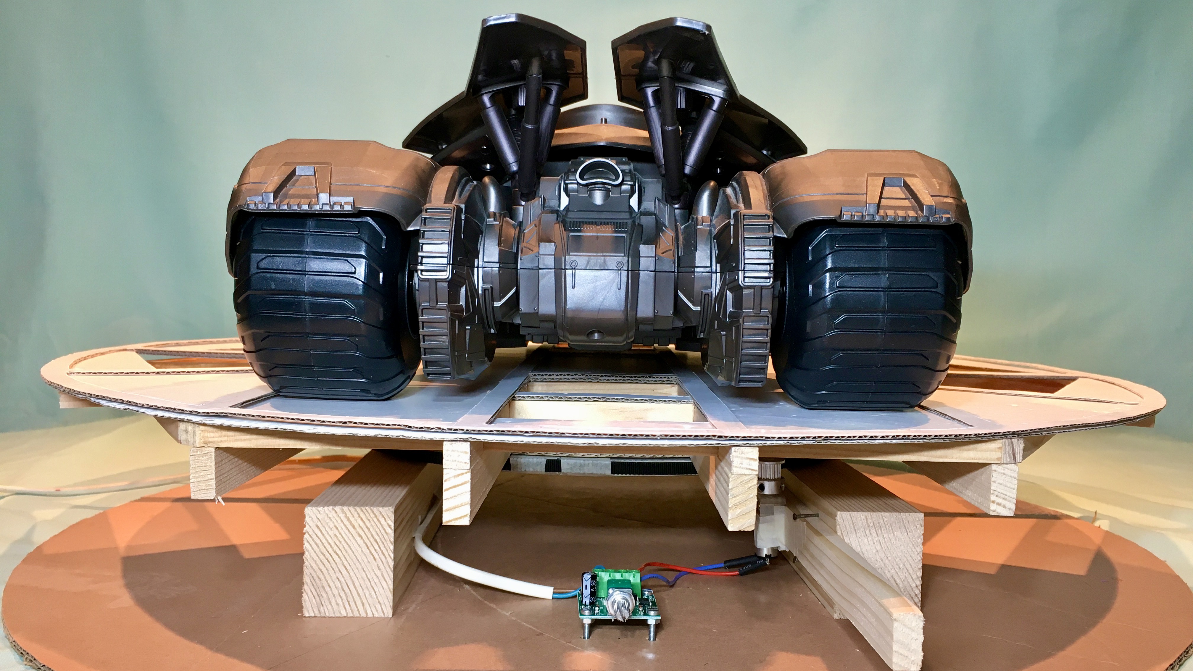 Ce test de motorisation a été réalisé avec un micro-moteur 6V à courant continu et un variateur de tension. Ce variateur est utilisé pour contrôler la tension d’alimentation du moteur et ainsi ajuster la vitesse de rotation de la plateforme. Le couple du moteur associé au rapport de réduction de l’engrenage suffit pour entrainer l’ensemble ; plateforme et modèle réduit de la Batmobile. Le test de motorisation est donc validé.