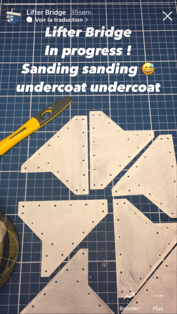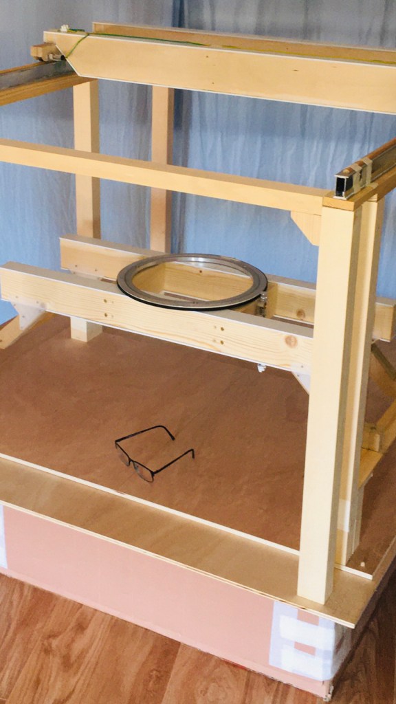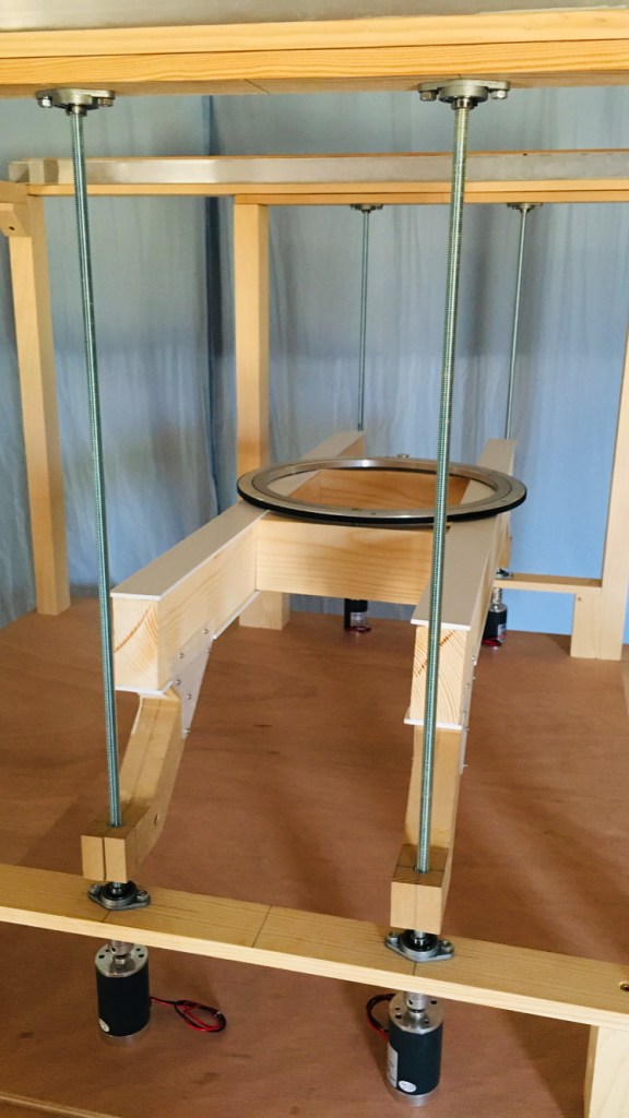 Comme pour le pont roulant bipoutre, la structure du pont élévateur est fabriquée en bois pour des raisons de facilité d’usinage, essentielle lors de cette phase de prototypage, et de maîtrise de l’impact environnementale du projet. Compte tenu des dimensions de certaines pièces constituant cet équipement, il n’était de toute façon pas envisageable de les imprimer avec une imprimante grand public. La perspective d’une fabrication en résine ou par impression professionnelle n’était pas non plus compatible avec le budget prévisionnel du projet.