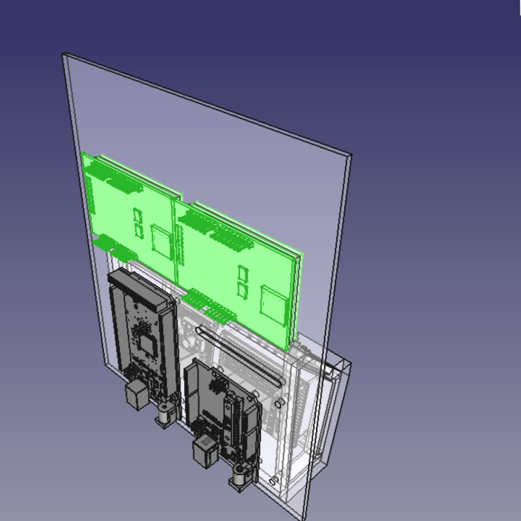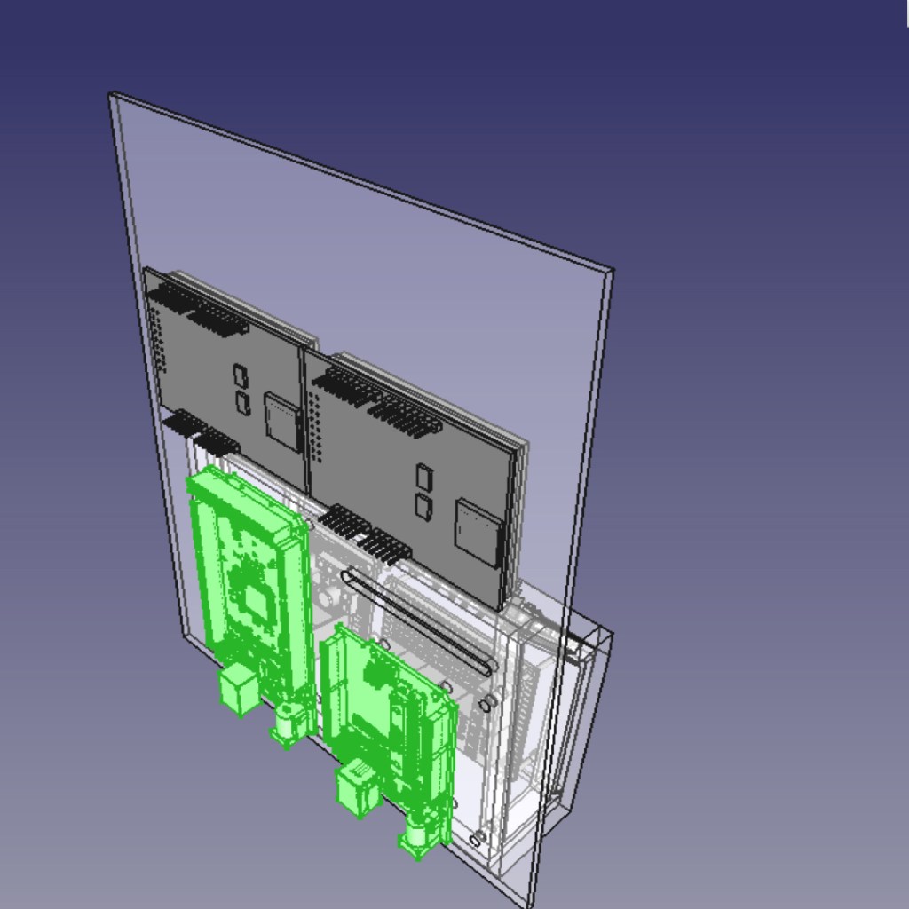 Les cartes Arduino Uno et Arduino Mega sont implantées à l’arrière du panneau de support des écrans des contrôle. La face de dessus face visible pour permettre le câblage des cartes avec les autres cartes électroniques de la console de commande.