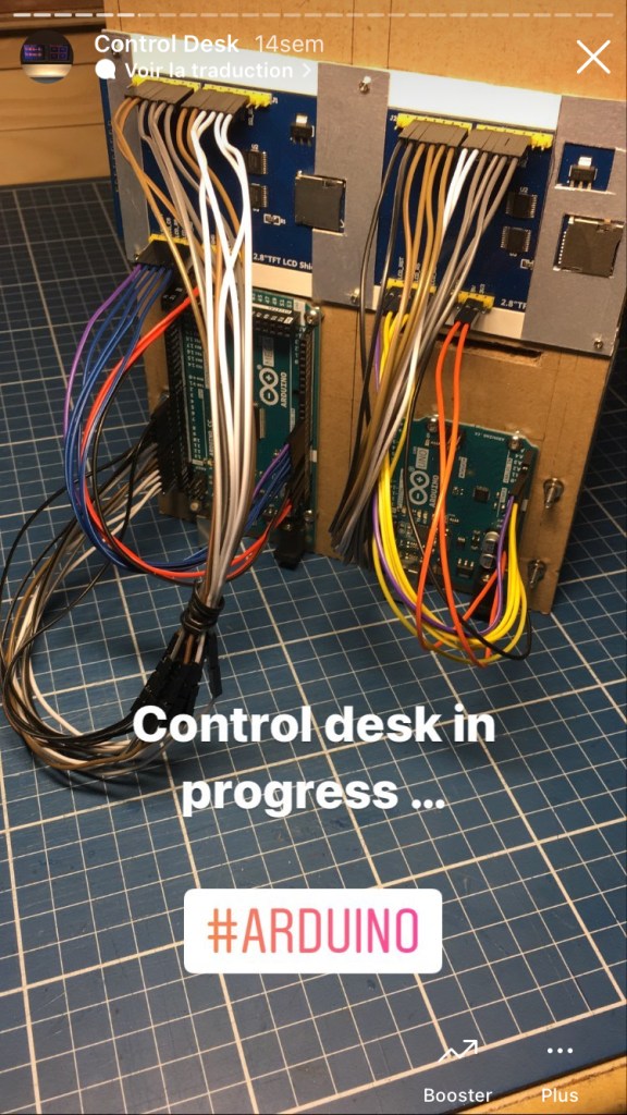 Deux cartes Arduino Mega équipent ce premier modèle de la console de commande. Ces cartes permettent de piloter l’affichage des écrans tout en conservant des broches d’entrées/sorties libres pour assurer d’autres fonctions comme par exemple la synchronisation entre les deux cartes.
