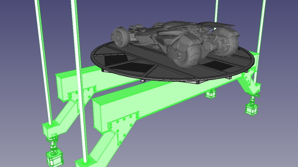 Le pont élévateur bipoutre du diorama assure la translation verticale de la plateforme rotative entre les différents niveaux de la Batcave.