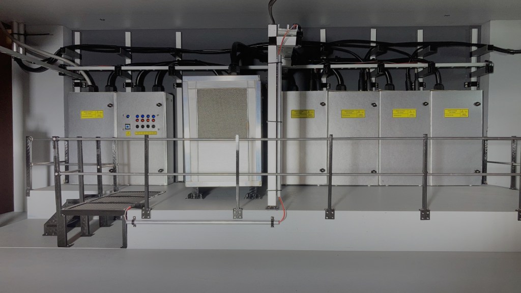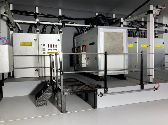 Ce prototype ne présente pas encore un niveau de finition abouti, compatible avec les ambitions de réalisme d’un diorama. La structure interne des deux armoires électriques principales est apparente, ainsi que celles des plateformes moteurs. Le câblage est très expérimentale et la console de commande est seulement simulée par un affichage sommaire sur un écran, même si des modèles opérationnels fonctionnent déjà pour la plateforme rotative et le pont roulant.