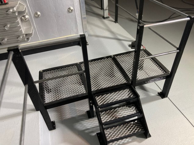 Dans un souci de réalisme et de cohérence avec les standards industriels, la plateforme du local électrique a été équipée de garde-corps assurant la sécurité du personnel, ainsi que d’une passerelle d’accès. Ces éléments ont été réalisés à l’échelle 1/12 par un assemblage boulonné combinant des pièces issues de l’impression 3D — notamment les poteaux des garde-corps et la structure porteuse de la passerelle — et des éléments métalliques, tels que les traverses des garde-corps et le caillebotis de la passerelle.