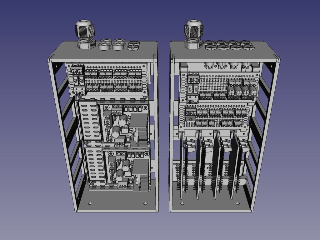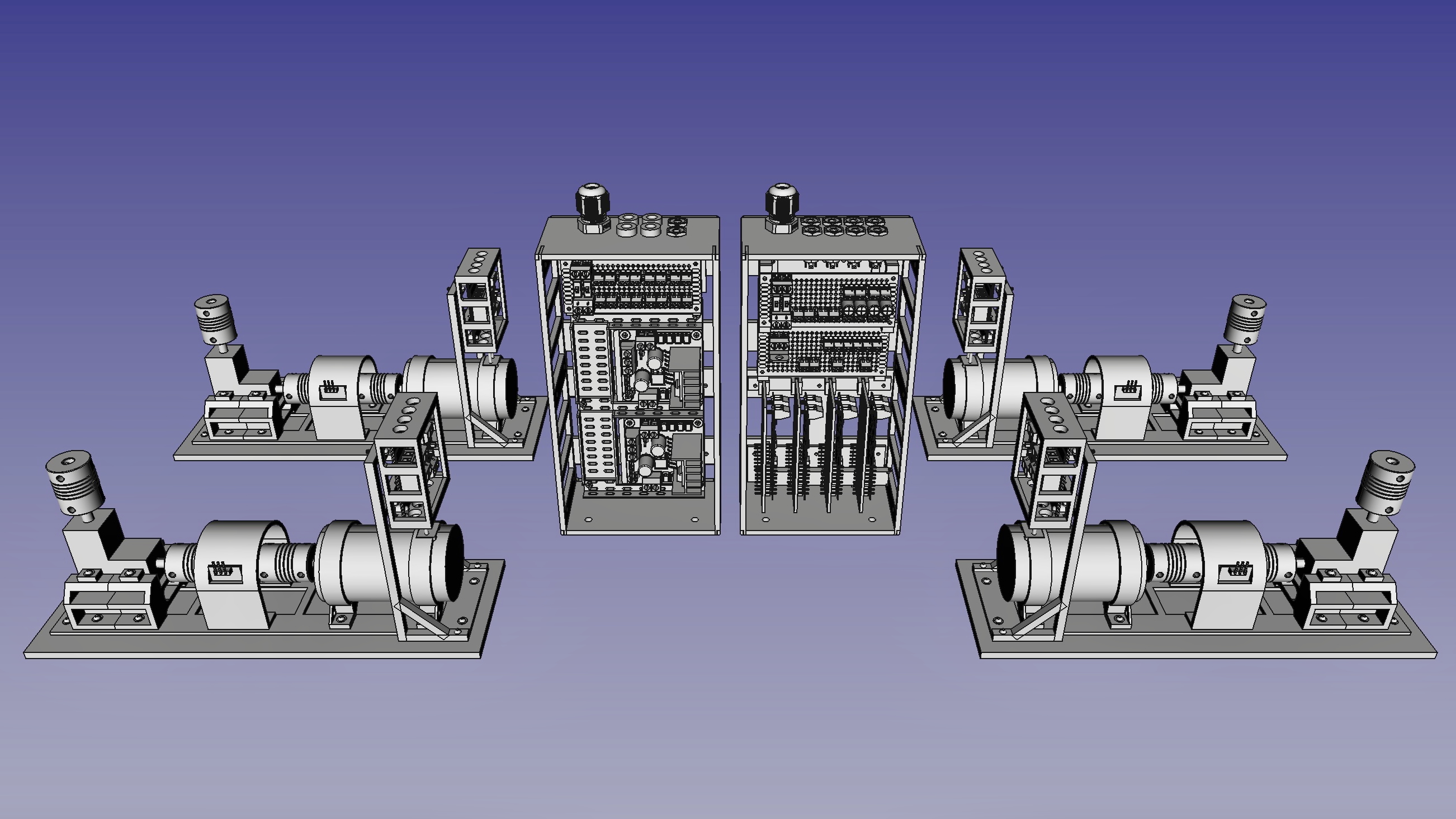 L’armoire électrique de gauche contient l’électronique de mesure de la fréquence de rotation des 4 moteurs, dont 4 cartes PCB manufacturées convertisseur de fréquence en tension. L’armoire électrique de droite contient l’électronique de distribution de l’énergie électrique vers les 4 moteurs, dont 2 cartes PCB manufacturées d’un double Pont en H. Les structures de ces deux armoires électriques sont toutes les deux identiques aux modèles opérationnels développés pour le poste électrique du diorama. Elles sont fabriquées par impression 3D ainsi que tous les supports internes de PCB et les chemin de câbles.