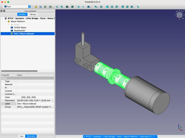 Contrairement à d’autres composants utilisés dans les systèmes industriels de la Batcave, aucun modèle 3D n’est disponible librement pour chacun dses composants de la plateforme ; moteur, roue codeuse, engrenage à renvoi d’angle. Par conséquent, leur modélisation 3D est réalisée avec le logiciel FreeCAD pour définir dans un premier temps leur design général. La prise en compte de leurs dimensions externes permet de présenter leurs intégration sur une plateforme.