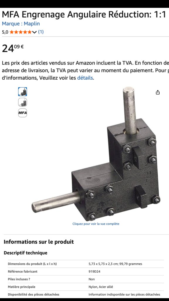 Le choix de ce type d’engrenage est relativement restreint sur un marché grand public autorisant des commandes à l’unité. Ce modèle d’engrenage angulaire est sélectionné pour son rapport de réduction de 1:1 mais aussi pour son design mécanique robuste, équipé de pattes de fixation.