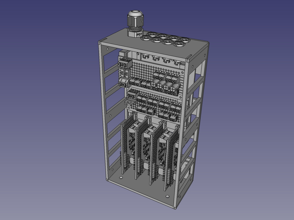 La phase de conception détaillée de la plateforme a apportée une modification au design de la structure des petites armoires électriques par rapport à celles déjà existantes sur le diorama. Ce nouveau design permet de prendre en compte le remplacement du bloc de jonction, initialement présent dans l’armoire, par un mini PCB. Cette structure est réalisée par impression 3D.