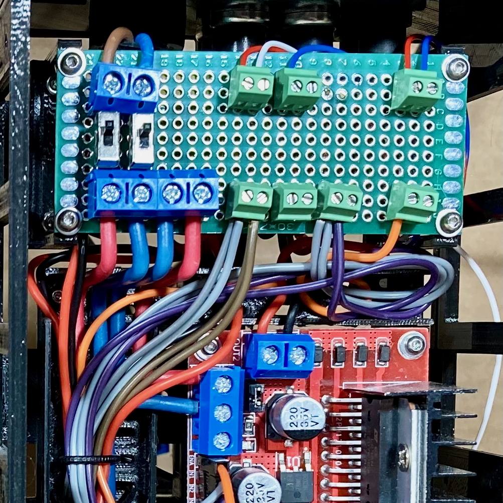 Le câble transmettant la commande de vitesse entre la console et l’armoire n°2 a été retiré. L’Arduino Uno fournit désormais quatre signaux à rapport cyclique réglable, permettant de piloter indépendamment la vitesse de rotation de chaque moteur.