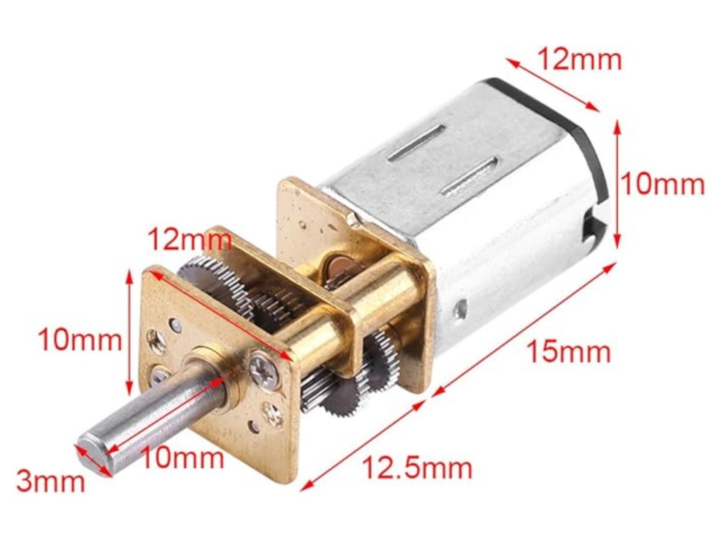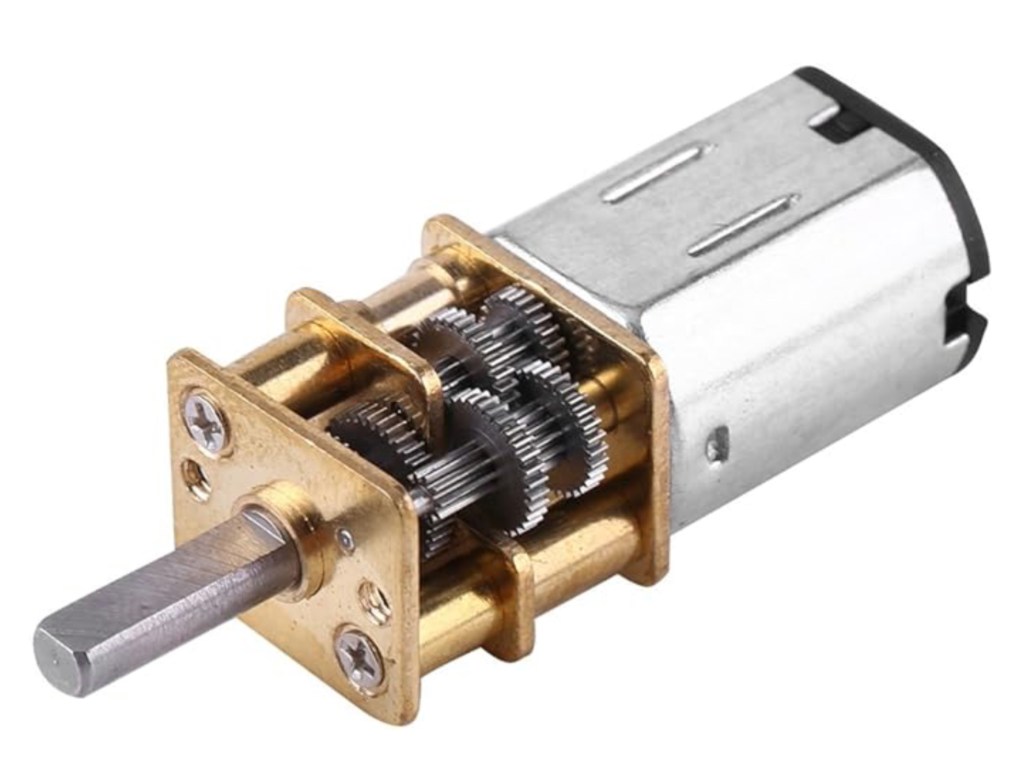 Le choix du moteur d’entraînement du système de transmission de la rotation s’est porté sur un micro-motoréducteur à couple élevé, présentant un rapport de réduction de 1:1000. Ce type de motorisation offre un compromis adapté entre compacité, couple disponible et facilité d’intégration, en cohérence avec les contraintes mécaniques et spatiales imposées par l’échelle 1/12.
