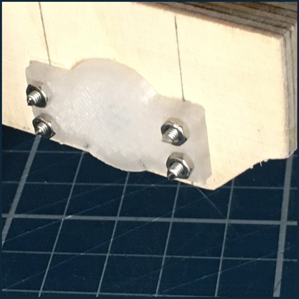 Cette pièce est boulonnée via des tiges filetées ancrées dans le sommier. Sa forme permet de maintenir un micro moteur 6VDC. Un système de fixation supplémentaire reste à l’étude pour le moteur.